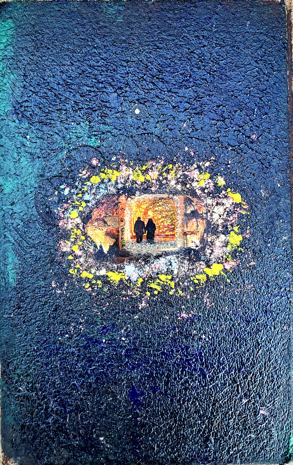 You will always be a part of our lives in mercurial mists of Aven Davu...acrylic and collage on old book cover